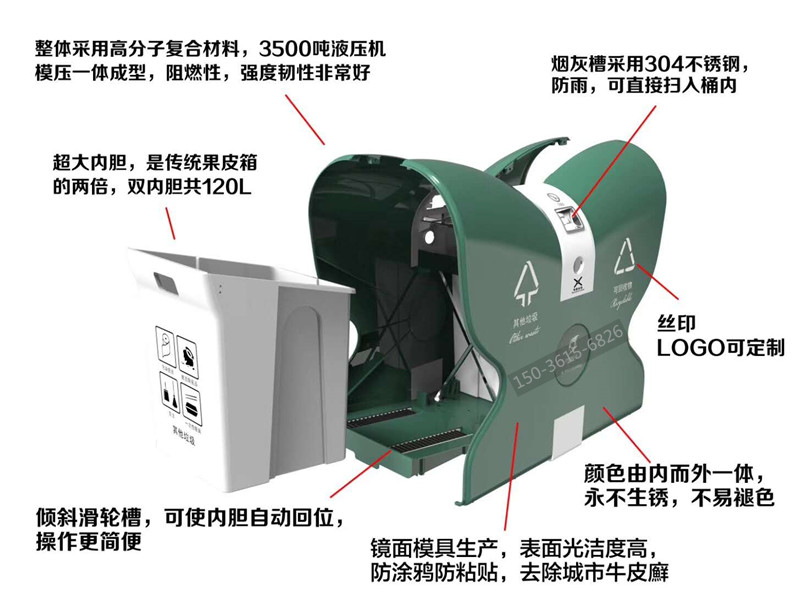 2. 產(chǎn)品特點(diǎn): 鏡面模具生產(chǎn),表面光潔度高,防涂鴉防粘貼,防砸,耐燒,永不生銹,不易褪色,耐酸堿,易清洗,使用壽命長(zhǎng),具有天然的防盜功能;操作簡(jiǎn)單,深受環(huán)衛(wèi)系統(tǒng)客戶青睞。